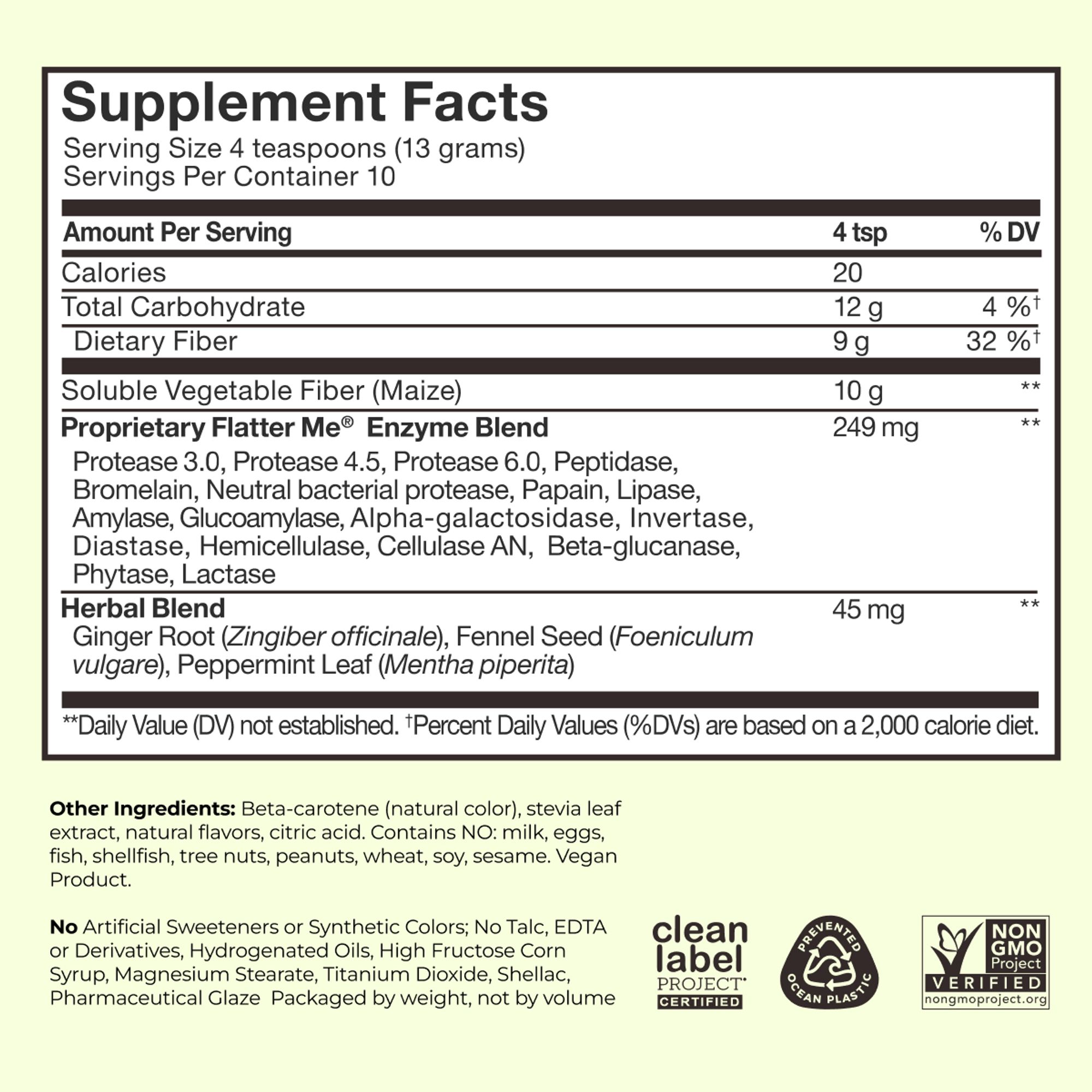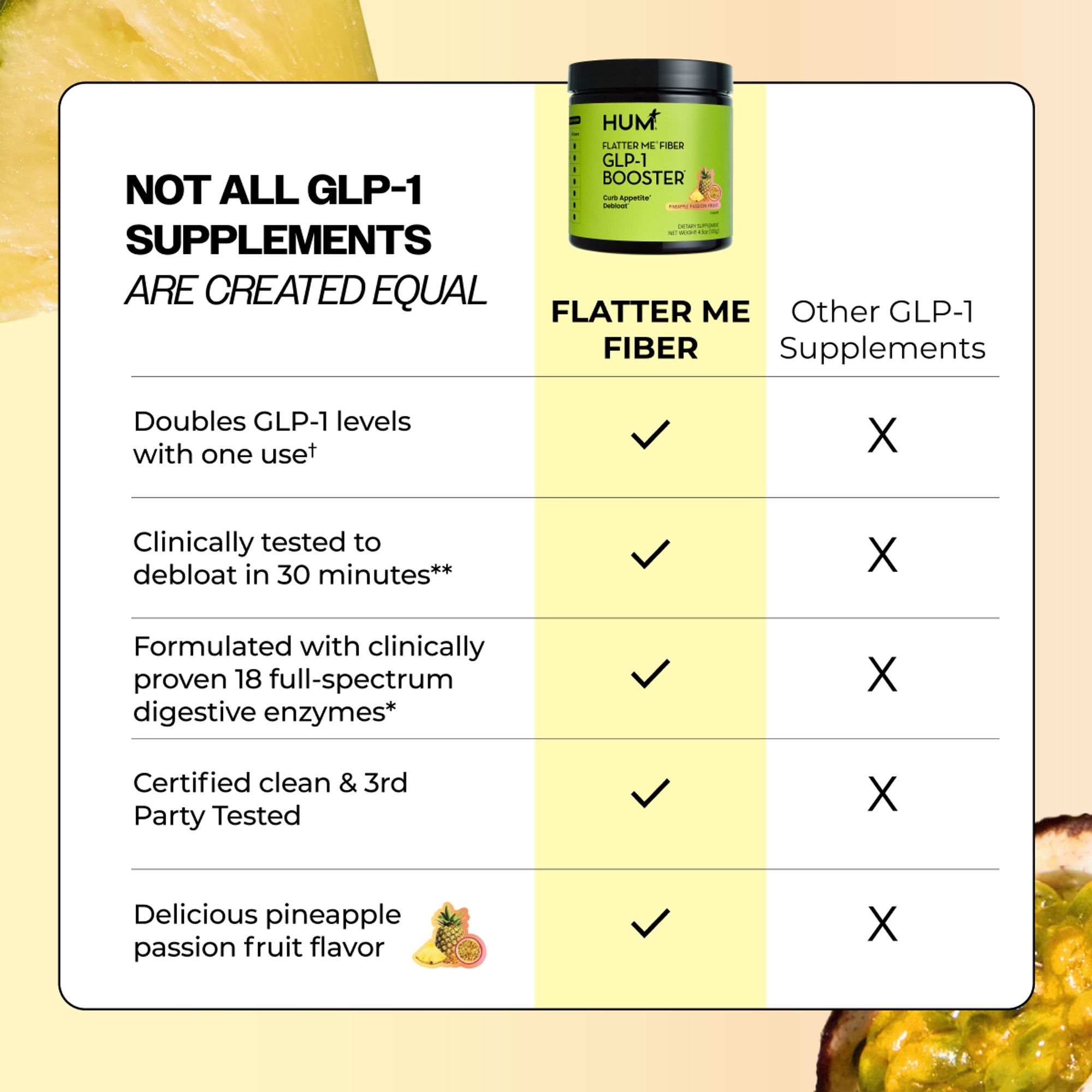 Flatter Me® Fiber pairs digestive enzymes with 10 grams of prebiotic fiber that boosts GLP-1 levels to help curb appetite and support fullness in just one use with a meal. It’s a great choice for those seeking daily digestive support with added benefits for appetite control.*†