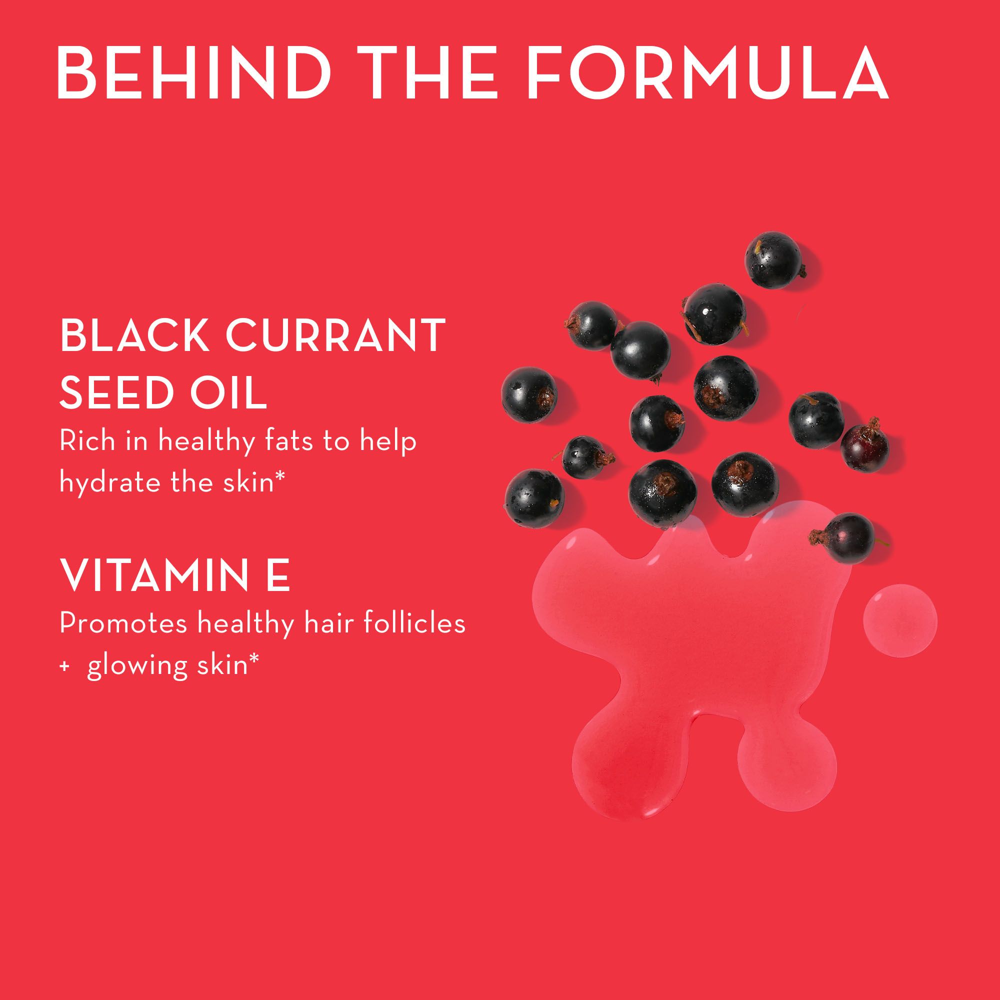 Formula with black currant seed oil and Vitamin E for hydrated skin and hair health.