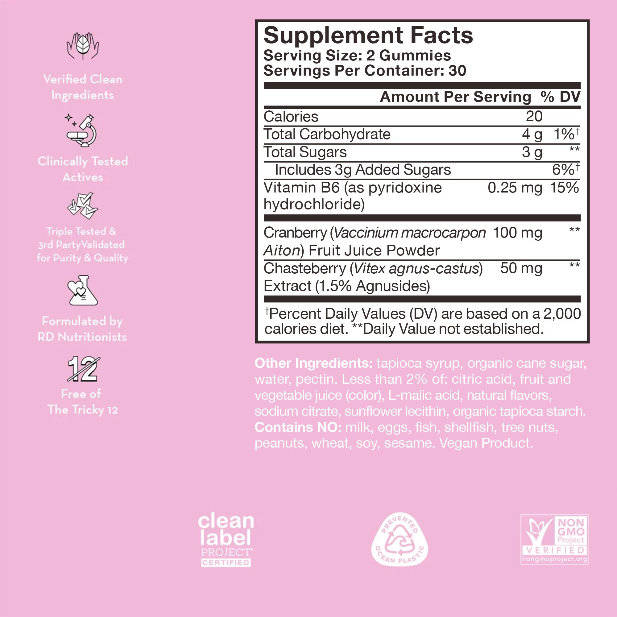 Clinically tested chasteberry extract and vitamin B6 to help ease PMS symptoms and support hormonal balance—plus cranberry for urinary tract health.*