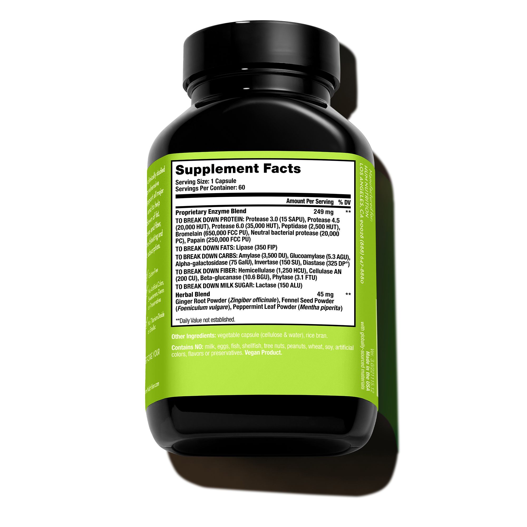 - 18 full-spectrum enzymes break down food to support healthy digestion + reduce bloating